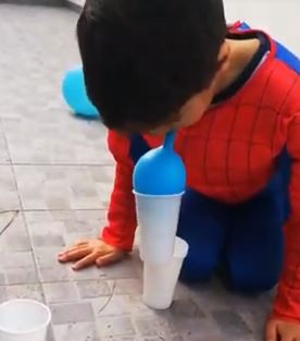 O 1º jogo foi com copos e 1 balão. Tinham de conseguir colocar todos os copos dentro de um, apenas com o balão. Enchendo o balão dentro do copo conseguem levantar o copo e colocar dentro de outro.